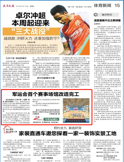 武漢軍運會相關場館設施項目計劃在明年4月全面竣工。