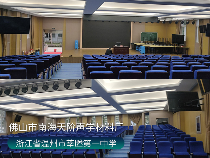 浙江省溫州市瑞安市農(nóng)場村莘塍第一中學(xué)會議廳項(xiàng)目,墻面使用穿孔吸音板,基材選用不燃堅(jiān)硬的玻鎂基材,飾面選用溫和的色調(diào)。整齊穿孔吸音板,吸音效果顯著,能吸收活動期間的噪音,回聲。