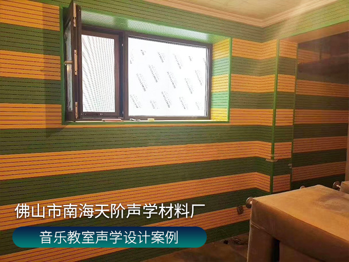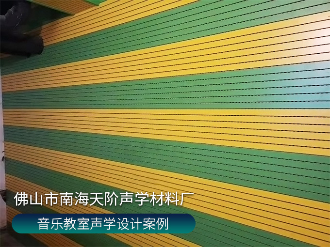 音樂教室聲學設計案例 ,墻面使用條形槽木吸音板,鮮艷的三聚氰胺飾面,青春活力,降噪又美觀。