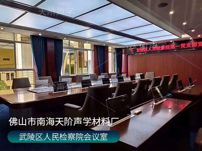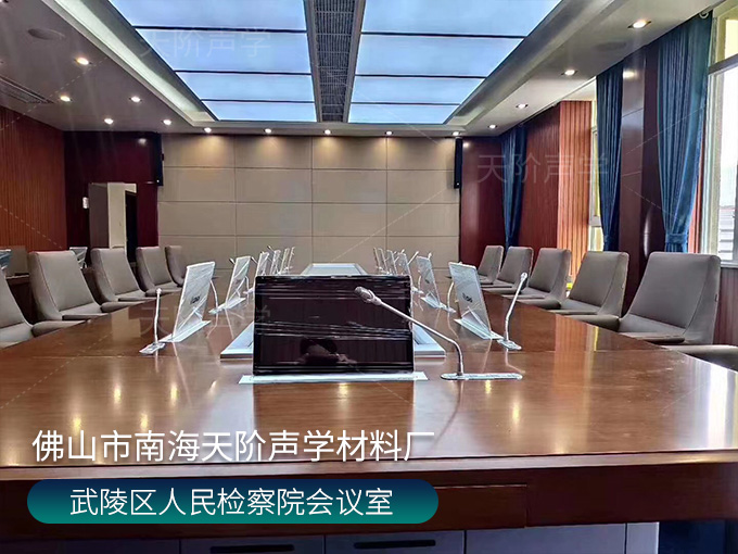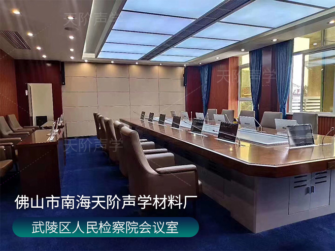 武陵區人民檢察院會議室,墻面使用槽木吸音板,選用不燃陶鋁板基材;加入軟包吸音板,高雅又有格調,消除回音和雜音。