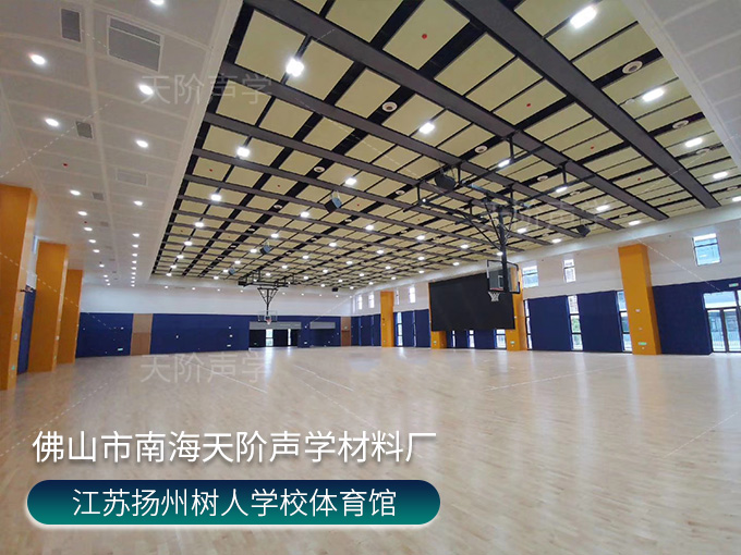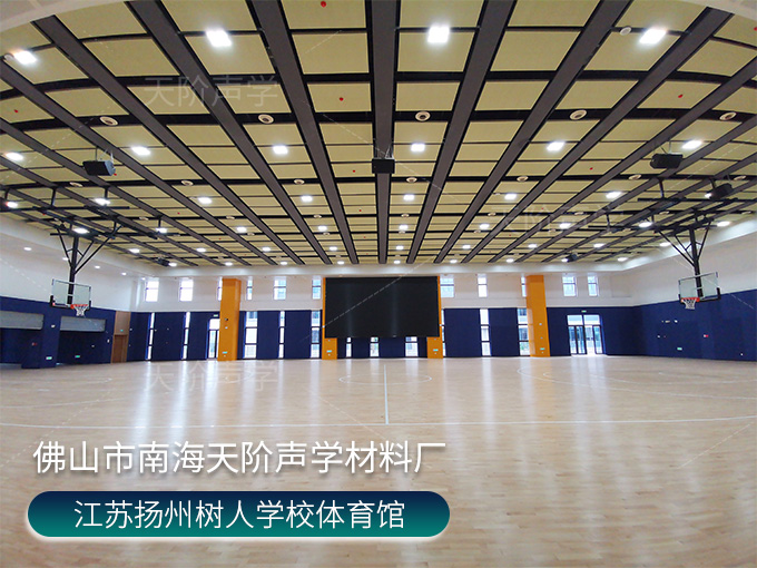 江蘇揚(yáng)州樹人學(xué)校體育館項(xiàng)目,使用平板吊頂空間吸聲體用頂部吸音裝飾;墻面選用白色+深藍(lán)色色調(diào)飾面的槽木吸音板,基材選用不燃的玻鎂基材,裝飾設(shè)計(jì)美觀,有出色的降噪效果。