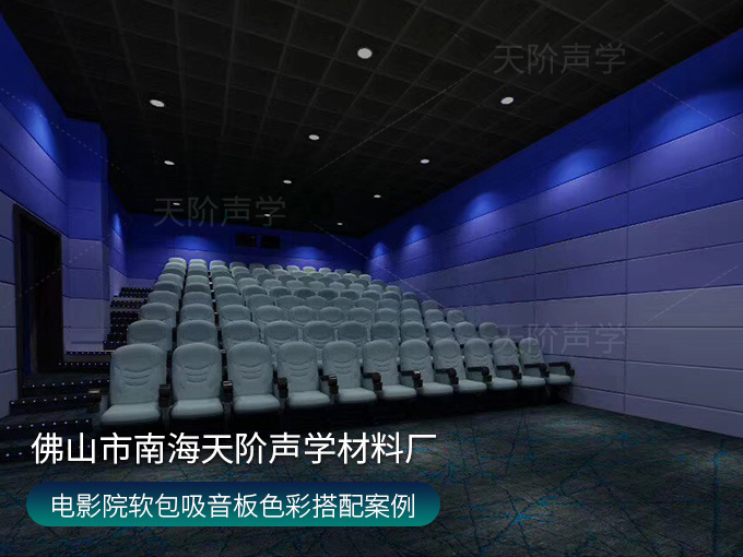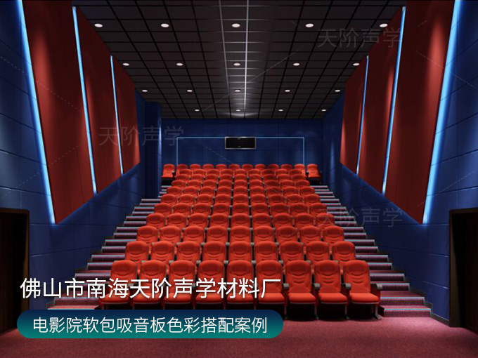 電影院軟包吸音板色彩搭配案例2 低調神秘的深色色調電影院設計,墻面選用聚酯纖維吸音板,拼色安裝設計,做不燃處理,舒適又安心,吸收噪音雜音很有效果。