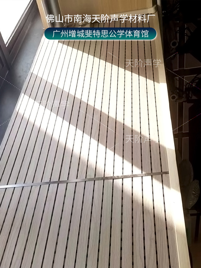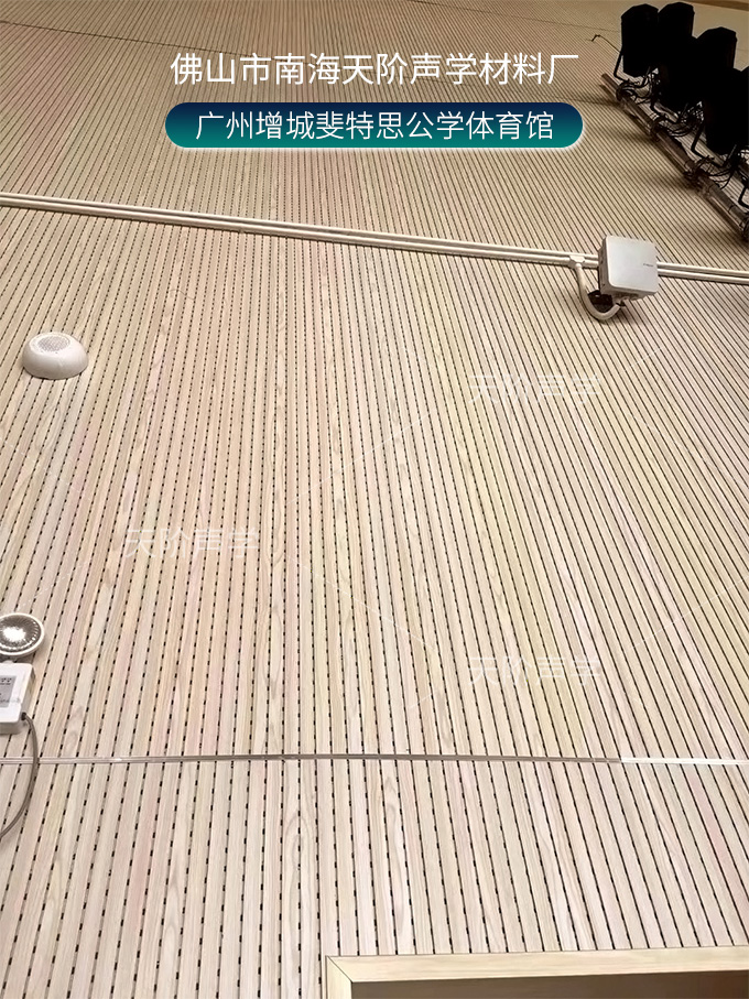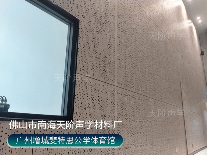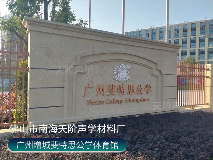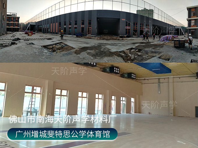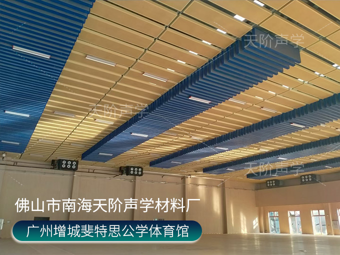 廣州增城斐特思公學(xué)項(xiàng)目,體育館選用天花吊頂平板空間吸聲體,色彩使用活力動(dòng)感的黃色+藍(lán)色搭配,時(shí)尚又美觀;多功能禮堂,選用高端定制穿孔吸音板,吸音降噪。