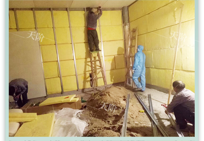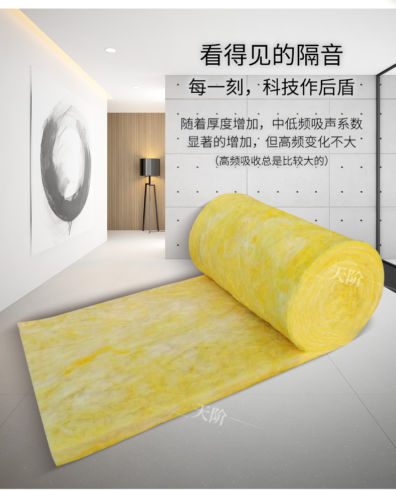 離心玻璃棉內部纖維蓬松交錯,存在大量微小的孔隙,是典型的多孔性吸聲材料,具有良好的吸聲特性。離心玻璃棉可以制成墻板、天花板、空間吸聲體等,可以大量吸收房間內的聲能,降低混響時間,減少室內噪聲。