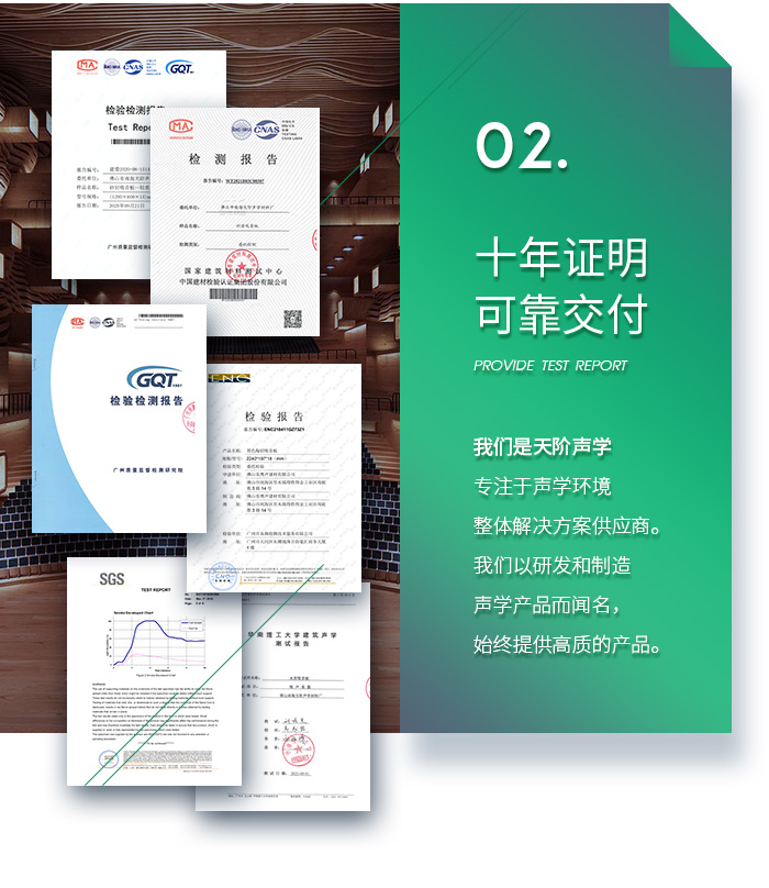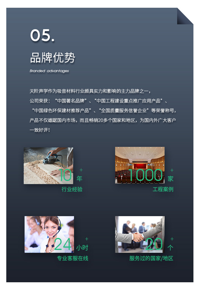 佛山市南海天階聲學材料廠作為當今中國吸音材料行業(yè)具有實力和影響的主力品牌之一,公司榮獲:“中國著名品牌”、“中國工程建設重點推廣應用產(chǎn)品”、“中國綠色環(huán)保建材推薦產(chǎn)品”、“全國質(zhì)量服務信譽企業(yè)”、等榮譽稱號,產(chǎn)品不僅雄踞國內(nèi)市場,而且暢銷多個國家和地區(qū),為國內(nèi)外廣大客戶一致好評!