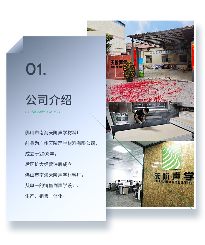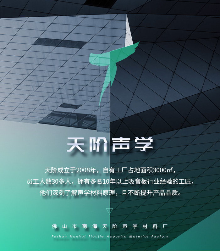 佛山市南海天階聲學材料廠前身為廣州天階聲學材料有限公司,成立于2008年,后因擴大經(jīng)營注冊成立佛山市南海天階聲學材料廠,工廠占地3000多平米,從單一的生產(chǎn)銷售到:聲學設計-生產(chǎn)-銷售-聲學工程施工一體化,是一家專業(yè)的聲學環(huán)境解決方案綜合服務商。