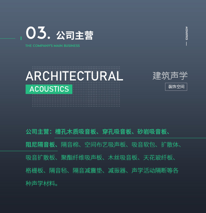 公司主營:槽孔木質(zhì)吸音板、陶鋁吸音板、砂巖吸音板、布藝吸聲板、吸音軟包、微孔吸音板、碳塑吸音板、聚酯纖維吸聲板、隔音板、隔音氈、隔音減震墊、減振器,干掛板與聲學活動隔斷、固定高隔間等各種聲學材料。