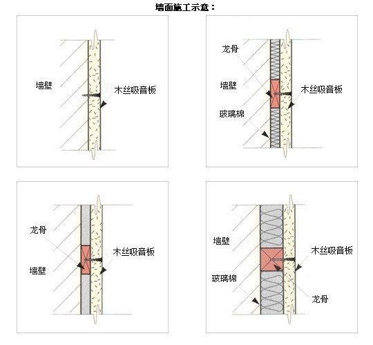 c.輕鋼龍骨,在高層較高或防火要求等級較高的時候,可能不允許施工木龍骨的情況下,一般采用爆炸螺絲吧小段的木墊片固定在輕鋼龍骨上,然后將木絲吸音板固定在木皮上即可。