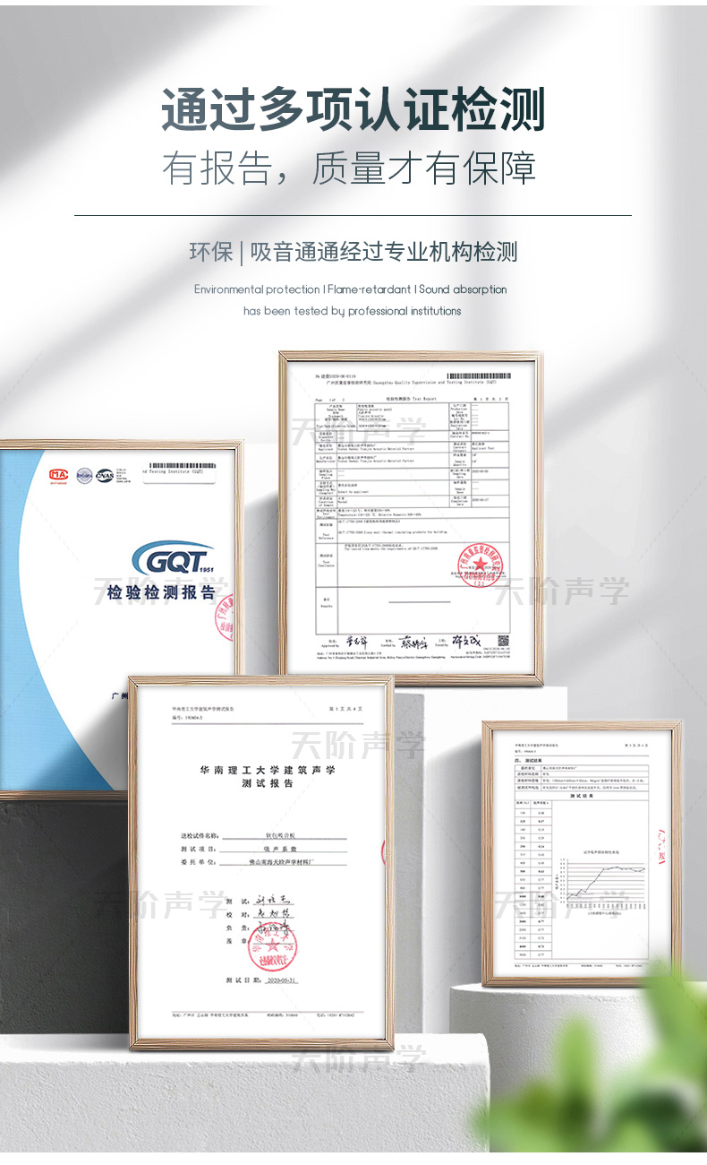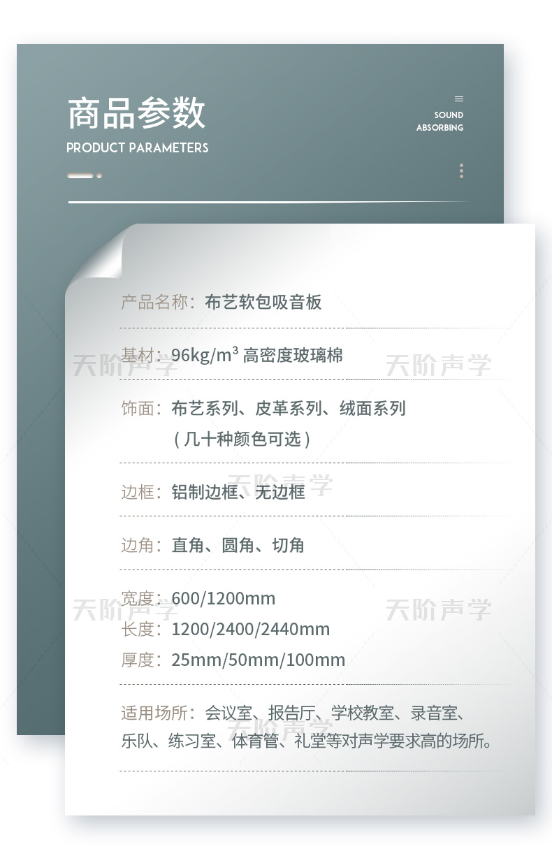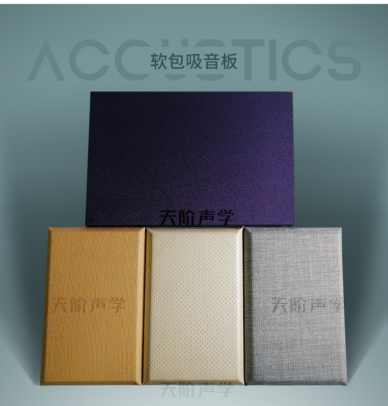 天階聲學布藝吸聲板采用高質的96kg/m3玻璃吸音棉。具有環保、阻燃、吸聲頻帶寬、裝飾性強、施工簡單、無粉塵污染等性能,飾面顏色及材料選擇性廣,能很好地滿足客戶多樣化的聲學及裝飾需求。